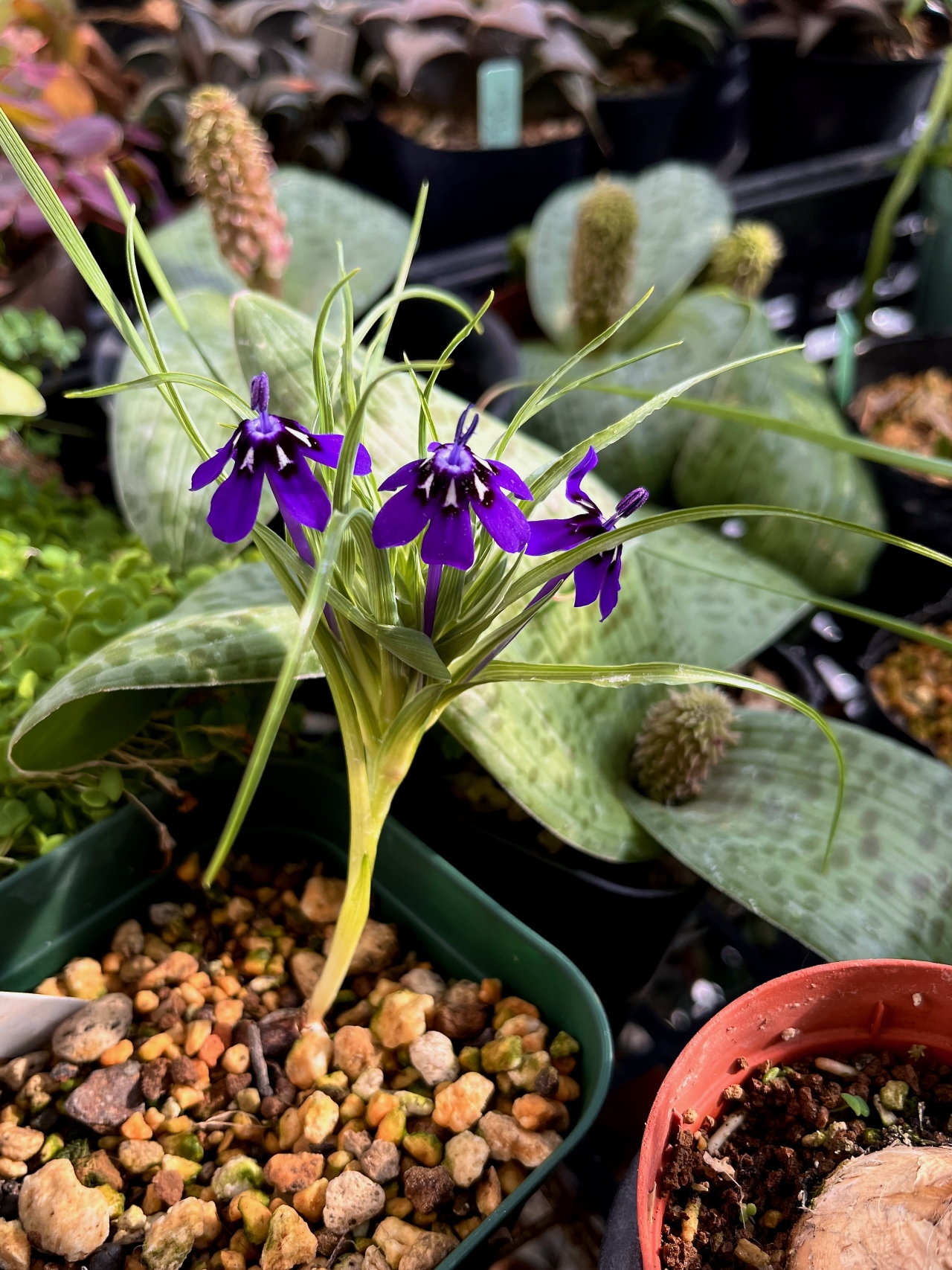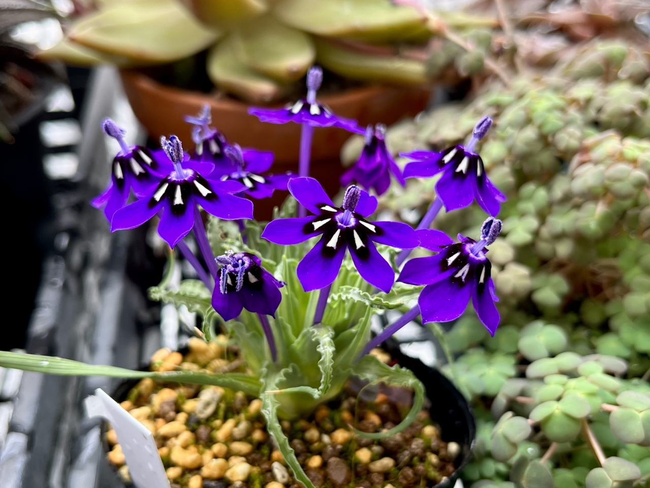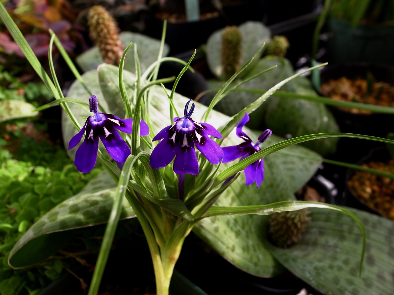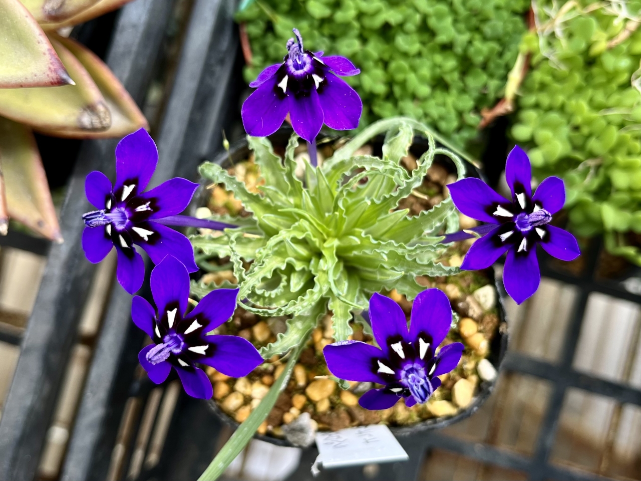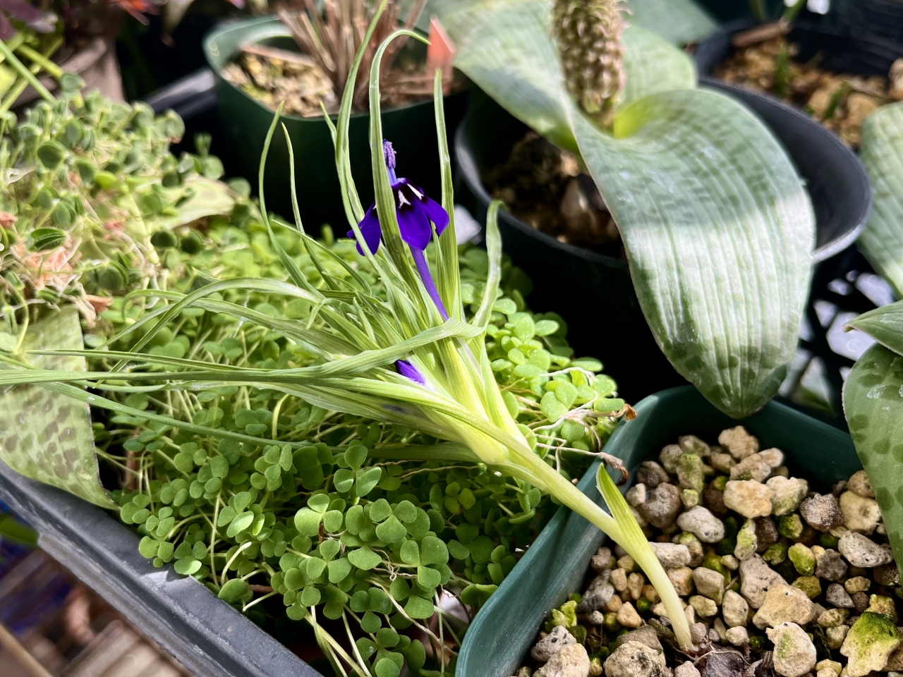 ラペイロージアを育てている方の多くは、葉の間から花が出てくると思っているようですが、ラペイロージアは茎がなく、少ない根生葉の中から、葉と同じ質感の何枚かの苞葉が現れ、苞葉に包まれた花が出現しているのです。